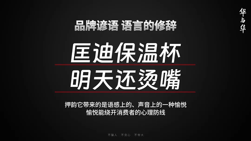 “匡迪保溫杯,明天還燙嘴”也押韻,押韻就能創(chuàng)造一種愉悅,而這種愉悅,它就能繞開(kāi)消費(fèi)者的心理防線。消費(fèi)者不僅接受了,還很開(kāi)心,開(kāi)開(kāi)心心就能說(shuō)給別人聽(tīng),讓它易于播傳。