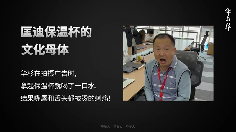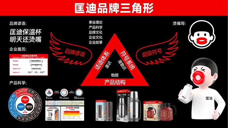 今天,“匡迪”這個(gè)名字、匡迪的杯子、匡迪燙嘴哥和“匡迪保溫杯,明天還燙嘴”無(wú)法再被分開(kāi),因?yàn)槿A與華出手,它們就成為了一個(gè)整體,這個(gè)包括了產(chǎn)品、話語(yǔ)和符號(hào)的品牌就成型了。