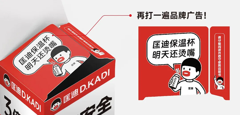 我們用“明天還燙嘴”這樣的修辭,來(lái)強(qiáng)調(diào)匡迪保溫杯保溫的性能——燙嘴!舌頭都燙痛了!這是一個(gè)有母體的場(chǎng)景,也是大家共同的經(jīng)歷經(jīng)驗(yàn)。而且很多保溫杯,本來(lái)就要貼個(gè)“小心燙嘴”的提示。