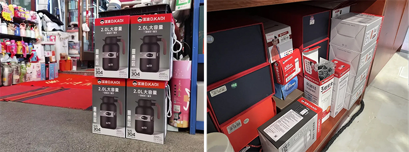 在門店里,我們發(fā)現(xiàn),保溫杯的陳列常常讓人眼花繚亂,品牌很難突出,店家就會(huì)把產(chǎn)品包裝當(dāng)成了陳列道具,堆放在店內(nèi)。所以,包裝本身又是終端陳列的道具,也是產(chǎn)品體驗(yàn)中的重要一環(huán)。