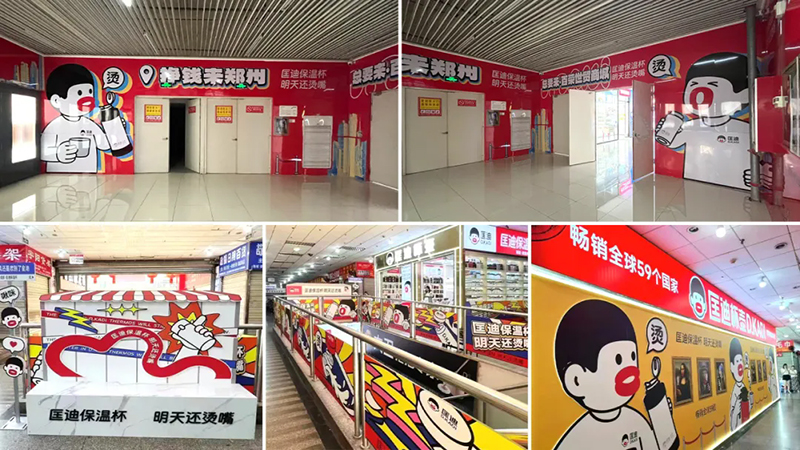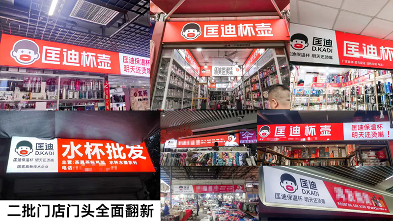 超級(jí)符號(hào)上門頭,讓它們?cè)谂l(fā)市場(chǎng)中成為最亮眼、最具吸引力的成交陣地,讓客戶的客戶也賺錢。當(dāng)你走進(jìn)批發(fā)市場(chǎng),最先撲面而來(lái)的就是那醒目的匡迪保溫杯門頭。