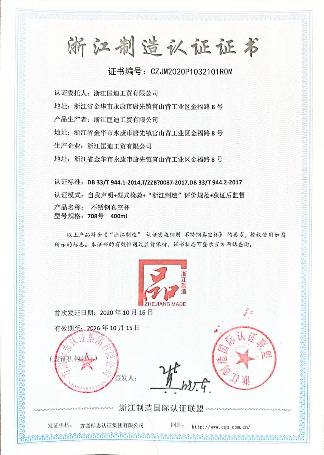 浙江制造認證證書